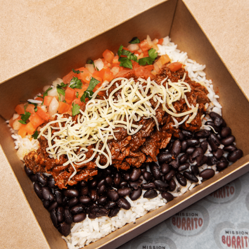 Burrito in a box: your choice of fillings, salsas & extras piled onto a bed of rice (gluten free).